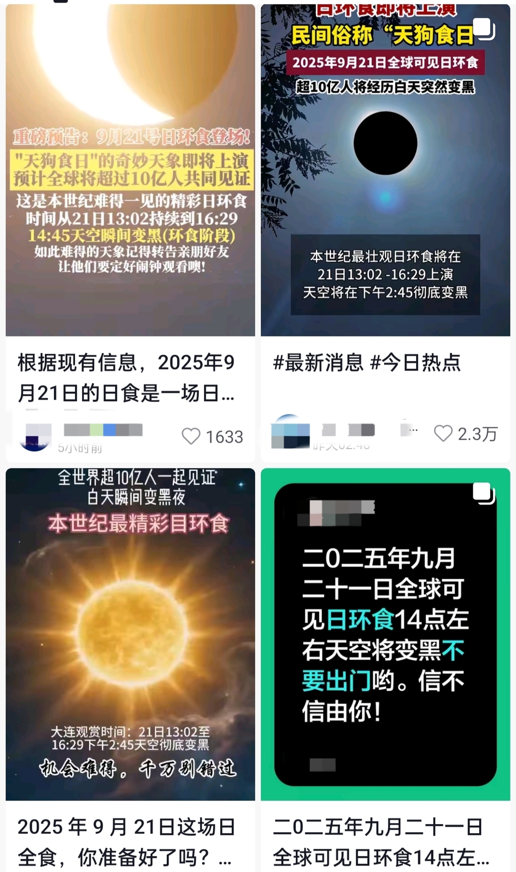 Dawan新闻“本世纪最令人惊叹的 - 最宽松的环形日食将于9月21日出现,世界各地有超过10亿的人见证它。作为回应,达万新闻记者要求专家验证该新闻是错误的,但是那天发生了一些日食,但在中国不可能观察到它。 9月21日,本世纪最神奇的环形日食最令人惊叹的消息是在线著名的。这个世纪最令人惊叹的环形日食是吗?该新闻在线很热。达万新闻记者指出,最近的新闻已经出现在许多社交平台上,并指出,环形日食将于2025年9月21日举行。其中,许多帖子和视频也使用了吸引人的句子,例如“这个世纪最令人惊奇的 - 这个世纪最令人惊叹的句子”,“本世纪最渴望的本世纪”,“这个世纪的最渴望”,“,”,“”,“”,“”世界上有超过10亿人的见证人和“在世界各地看到”来描述环形日食。清楚地提到,外观的时间是从13:02到9月21日的13:02到16:29,天空将在当天的2:45 AM完全是黑色的。记者没有官方平台在6月21日发布了这一消息,但在2020年6月21日发布了这一消息,一张ecnorly selor:solull of Selor:solull of 2020年,媒体上播出了媒体,这是媒体的播放。本世纪将在-21 In -21中从13:02到16:29举行,而天空将在下午2:45举行。“视频吸引了广泛的关注,偏好的数量超过300万。信息,例如,在网上太阳能eclipse的出现时,提到的invideo的出现与普通的在线信息相当一致。由中国科学院的紫色山天文台:新闻不是真的,但这是的确,今年9月21日那天将有一些日食吗? Dawan News的记者联系了Anhui省级天文学会。工作人员回答说,根据他们的信息,有消息说,这是9月21日本世纪最神奇的环形日食。实际上,那天有轻微的日食,但在中国看不到。记者还指出,中国科学学院紫色山观测的官方网站更新了流行的科学内容,并指出,今年Sepyembre 21期间有轻微的日食,在东大洋洲,西南太平洋西南太平洋地区和南极地区的某些地区中发现了中国。随后,记者联系了中国科学院的紫色山观测,以证明介绍了天文台科学人口和后勤中心副主任王·凯乔(Wang Kechao)。ng计算了许多机构 - 科学天文台的日历计算小组和科学家,这是9月21日的部分日食。这种日食可以在大洋洲东部,西南太平洋地区和南极的某些地区找到。它在中国不可见。最大日食约为0.79,但不会有环形日食或总太阳日食。因此,互联网谣言说,环形日食将在9月21日举行并非如此。在太阳日食,稍微日食和环形日食之间的差异很大程度上是月球,地球和太阳的相对儿童位置。在总太阳日食期间,月亮完全阻挡了太阳,一部分太阳在轻微的日食期间被月球封闭,在环形日食期间,太阳的中心被遮挡了,但边缘是明亮的,形成了混合物。 Dawan新闻记者Han Yu负责编辑:ZHang ju请关注新闻回复服务协会的演讲